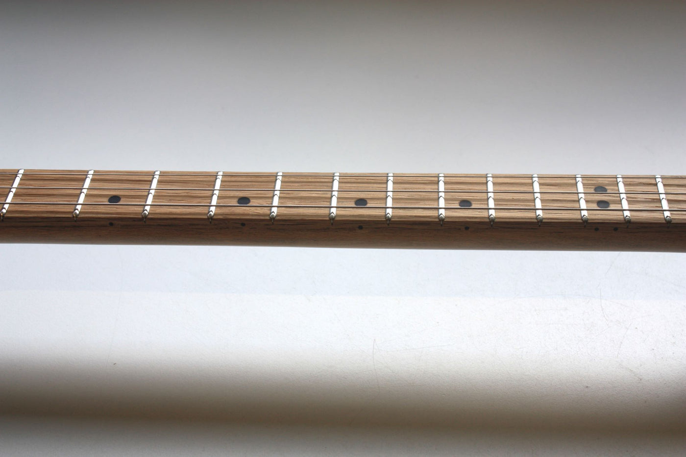 Traditional "Romeo & Julieta" cigar box with Meranti neck -LEFT HANDED Blackwood Tek fretboard with Van Gent super jumbo frets. White position dots and white edge dot markers, machine screw nut. Our guitar necks are fully profiled by hand using traditional methods for great playability and comfortable in-the-hand feel. Finished in traditiona...