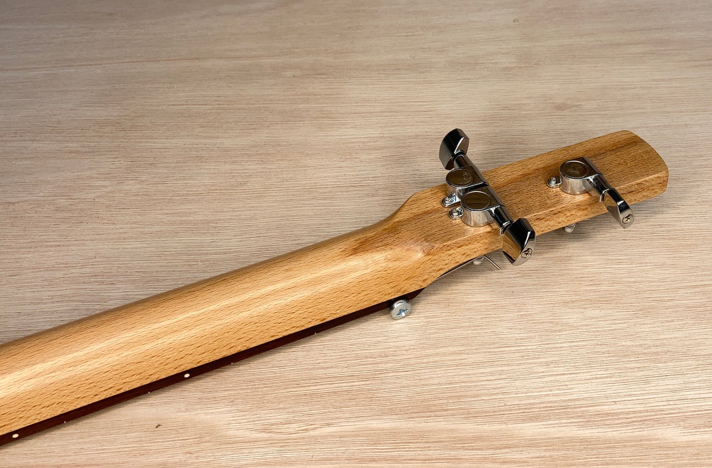 Traditional "Romeo & Julieta" cigar box with Meranti neck -LEFT HANDED Blackwood Tek fretboard with Van Gent super jumbo frets. White position dots and white edge dot markers, machine screw nut. Our guitar necks are fully profiled by hand using traditional methods for great playability and comfortable in-the-hand feel. Finished in traditiona...