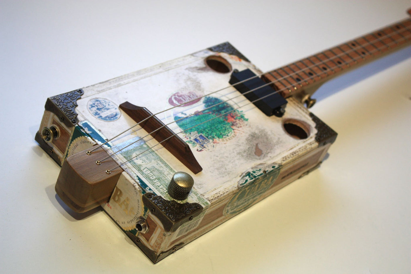 A beautiful paper covered "Diplomaticos" cigar box with matching chrome hardware, ace of spades sound holes and wrist guard. The matching wood tones with the extra nice additions has made a great looking guitar that produces a great powerful sound for both at home and professional playing. As the box is reused it does have a couple of marks on i...