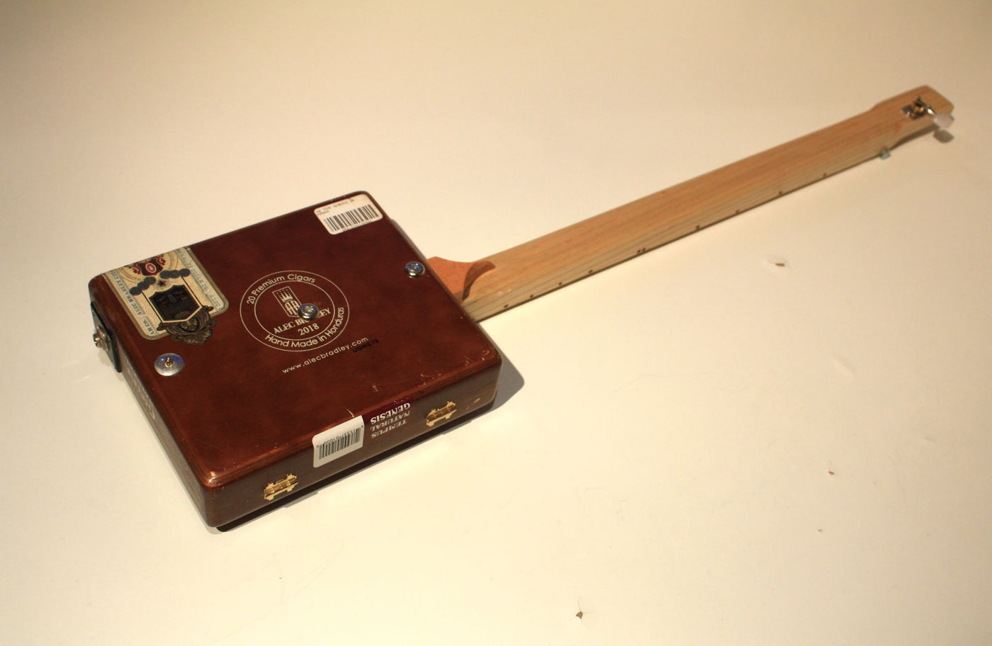 Absolutely the simplest ever guitar- a piece of recycled wood, one string and a strat syle electric pickup. Designed to be played on the lap, this is real back to the roots stuff. The wood is recycled, originally coming from my father's pigeon loft in South Yorkshire! Stained, with a satin oil finish. Open back machinehead, strat style pickup...