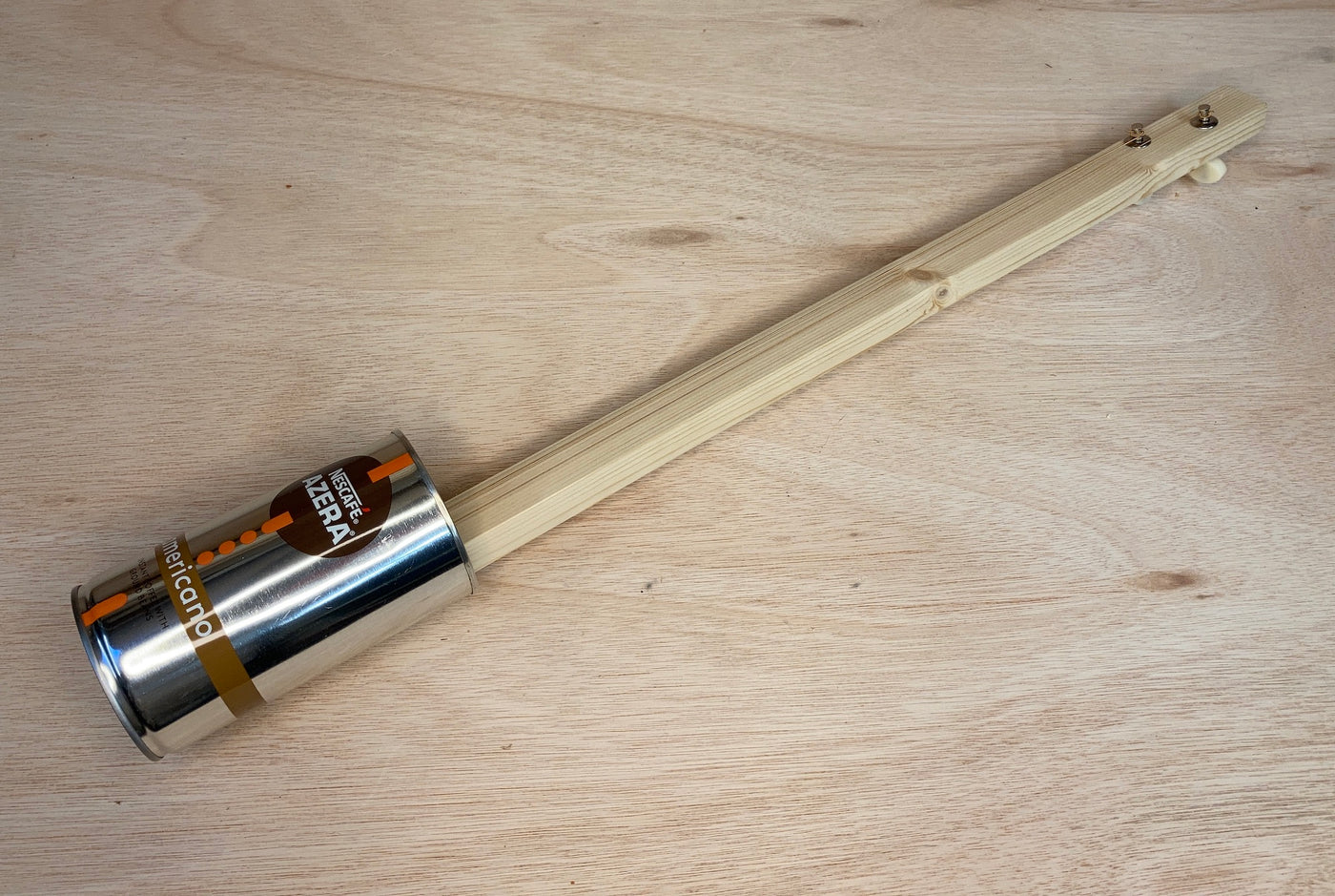 Super basic 2 stringer, tune it how you like - this is tuned with a root and a 5th, C and G. We acquired this a part of the estate of a customer of ours, so we don't know who made it. Ideal for a bit of tinkering if you want to add a piezo or electric pickup to it.Illy coffe can, pine neck with burned-in position markers. Bronzewound strings, uk...